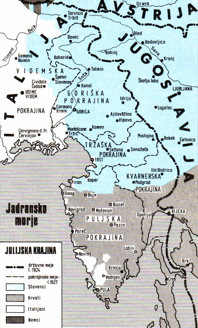 Narodnostne, gospodarske in socialne razmere Primorsko ozemlje, ki ga je novembra 1918 zasedla italijanska vojska in je bilo januarja 1921 z rapalsko pogodbo priključeno k Italiji, se je v razdobju med obema vojnama imenovalo Julijska krajina — Venezia Giulia. Obsegalo je avstrijske dežele Goriško-Gradiščansko, Trst in Istro, od dežele Kranjske pa idrijski in postojnski okraj ter trbiški okraj od Koroške. Od 1924 dalje je tudi Reka pripadala Italiji. Velike razlike med zadnjim avstrijskim in italijanskim štetjem so bile le deloma posledica izseljevanja Slovencev in Hrvatov ter priseljevanja Italijanov. Nanje je vplivala predvsem težnja italijanskih oblasti, da prikažejo italijanski značaj novo priključenega ozemlja. Po nekaterih ocenah je po prvi svetovni vojni pripadlo Italiji okoli 550.000 Slovencev in Hrvatov, od tega nad 300.000 Slovencev, kar je v tistem obdobju pomenilo skoraj tretjino slovenskega naroda. Geografska razporeditev prebivalstva se je kazala v socialni strukturi tako, da je slovensko in hrvaško prebivalstvo v pretežni večini pripadalo kmečki plasti, italijansko vzhodno od etnične meje pa višjemu meščanskemu razredu. V mestih je bil delavski razred narodnostno mešan. Asimilacija slovenskih in hrvaških delavcev je že pred prvo vojno prenehala, obenem pa se je v Trstu in Gorici razvijal tudi slovenski srednji meščanski razred, ki je z uveljavljanjem na gospodarskem področju začel ogrožati hegemonijo italijanske buržoazije. Gospodarski in socialni napredek slovenskega prebivalstva je bil glavni razlog za narodnostna nasprotja v mestih, ki so rasla od narodnega preporoda dalje in so po priključitvi dežele k Italiji prestopila mestne in deželne okvire. |